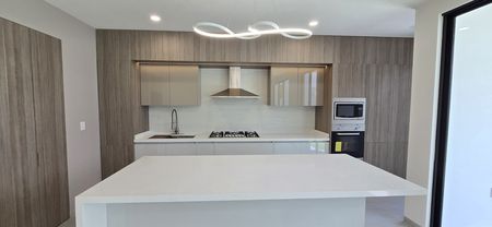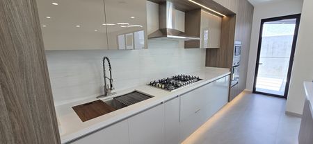 Planta baja: amplio recibidor, medio baño, cocina equipada con barra de cuarzo blanco, alacenas con enchapado de alto brillo, estufa, campana y torre de hornos, área de lavado techado, amplio jardín trasero.