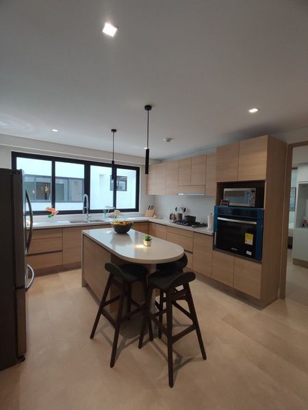 • cocina integral con isala, amplios gabinetes de guardado , espacio para lavavajillas y alacenas grandes