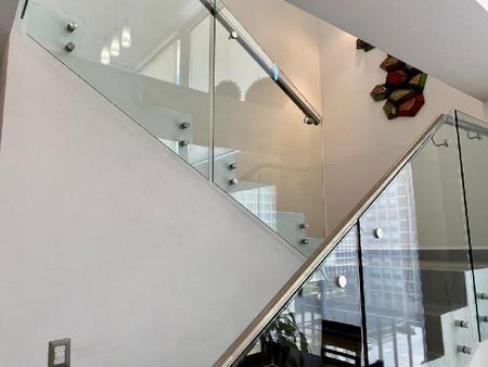Escalera con barandal de cristal templado que brinda un toque contemporáneo