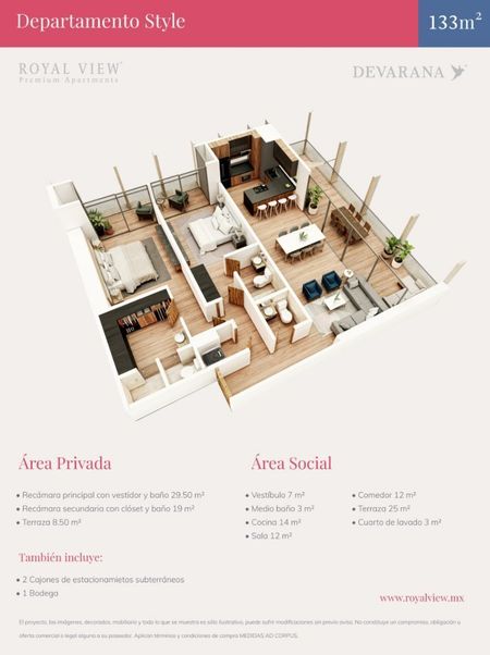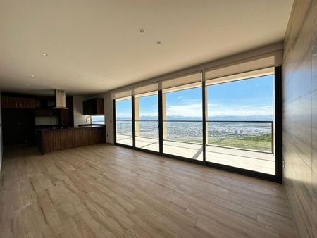 El departamento cuenta con 133 m2, 2 recamaras, la recamara principal cuenta con walking closet y baño, 2 baños completos , 1 medio baño, área de lavandería, sala, comedor, terraza amplia con una grandiosa vista al valle.