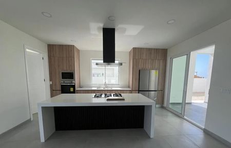 • Cocina con cubiertas de quarzo equipada con horno, refrigerador y microondas.