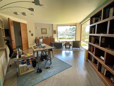 El área social se extiende al jardín principal, que tiene aproximadamente 320 m2 de superficie. Hay escaleras que descienden hacia una terraza con un área de aproximadamente 110 m2. La terraza tiene capacidad para 12 personas y ofrece acceso al jardín, ambos orientados al sur. Además, en esta área se encuentra una recámara secundaria con closets y baño completo, que puede funcionar de manera independiente para las visitas. También hay una toilette para visitas y un amplio salón para usos múltiples.