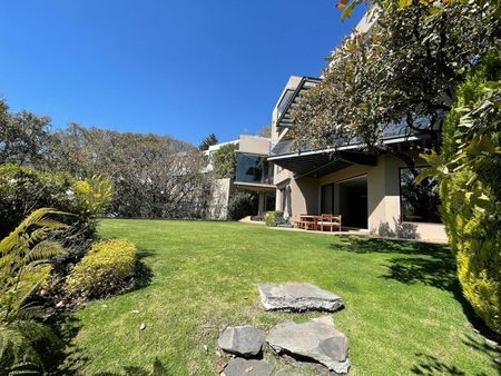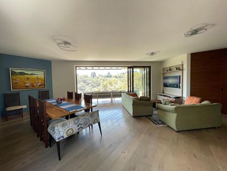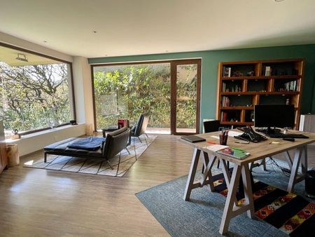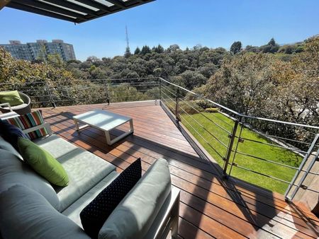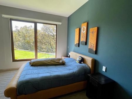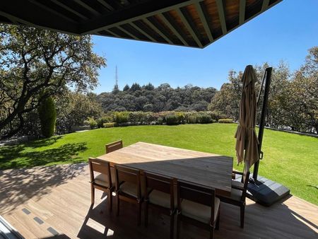 Hermosa casa en renta ubicada en Tepozcuautla Cumbres de Santa Fe, rodeada de un exuberante bosque. La fachada principal de la casa está orientada al sureste, ofreciendo vistas impresionantes a la cañada, mientras que la fachada de acceso se encuentra en el noreste.
