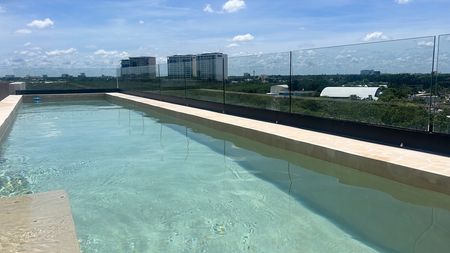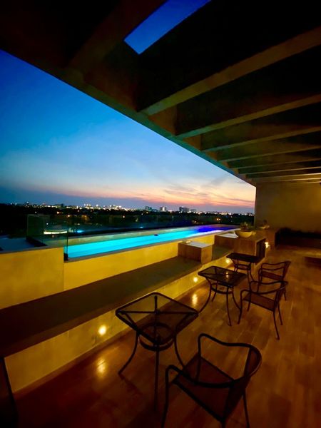 Una hermosa alberca en el rooftop con una vista panorámica alucinante de la ciudad , cuenta con iluminación