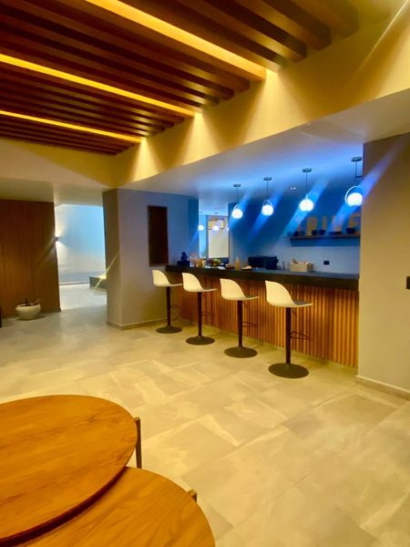 Un amplio bar con mesas y salas de excelente calidad para pasar tiempo increíble con una vista espectacular