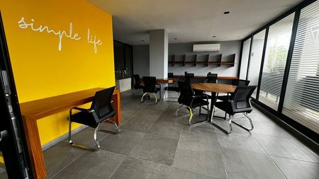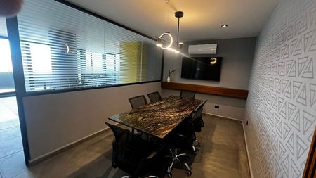 Área de trabajo precioso con multiples mesas cómodas, aire acondicionado e internet ademas cuenta con una sala de juntas privada espectacular con una gran pantalla