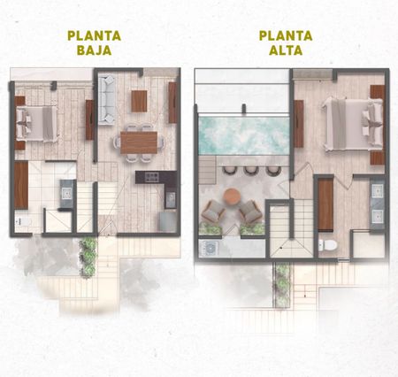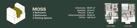 La tipología Moss cuenta con 2 recámaras, 2 baños completos y 2 estacionamientos. Diseñada para quienes valoran la comodidad y el estilo, es el espacio ideal para vivir con funcionalidad y disfrutar de un entorno moderno y equilibrado.