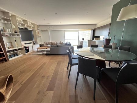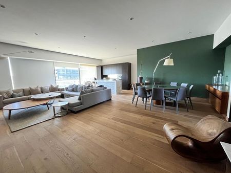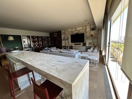 Estancia de gran tamaño, sala, comedor, barra/bar y terraza.