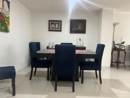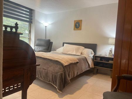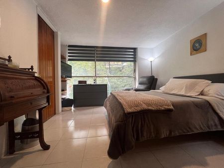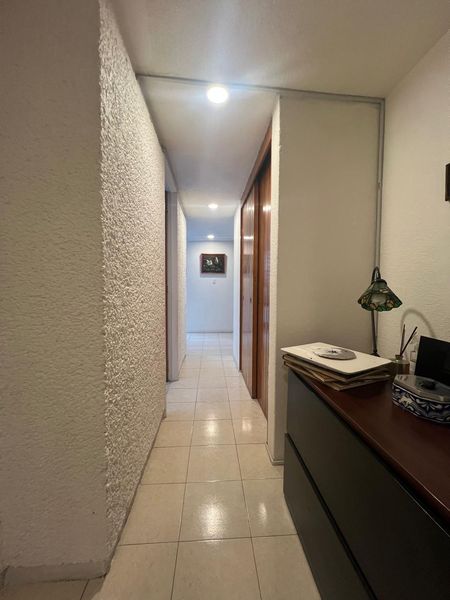 El departamento está en esquina lo que proporciona buena iluminación y vistas a las copas de los árboles, consta de sala, comedor, cocina con espacio para un desayunador, recámara principal con baño, una segunda recámara, baño completo que da servicio a la segunda recámara y a visitas, patio de lavado, cuarto de servicio con baño y un cajón independiente de estacionamiento.