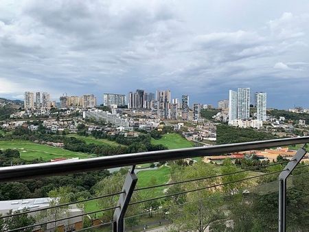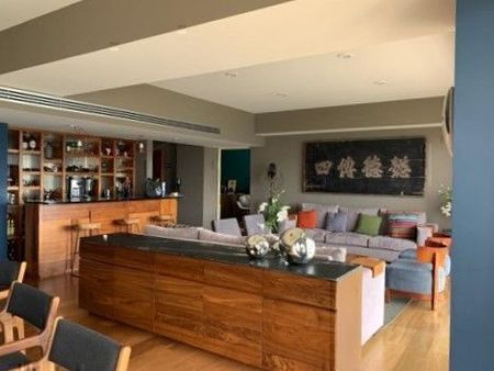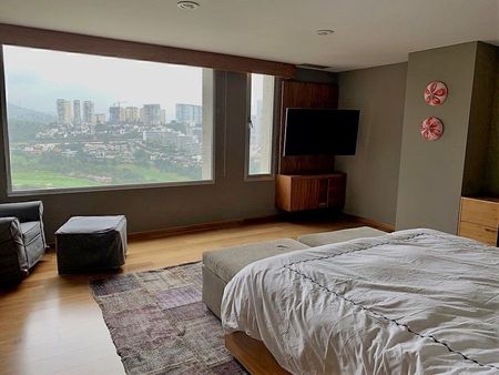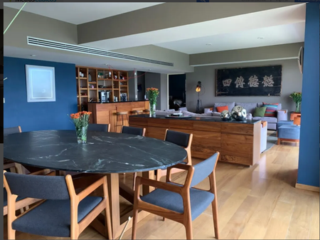 El departamento cuenta con sala/comedor de muy buen tamaño con salida a una terraza que tiene excelente vista y bar con barra, baño de visitas, family room y estudio con áreas de trabajo.