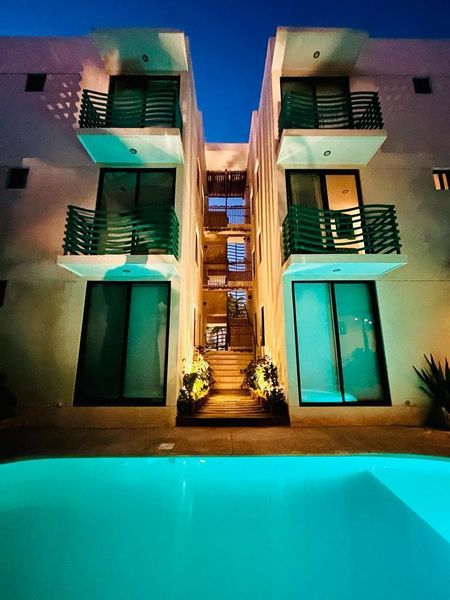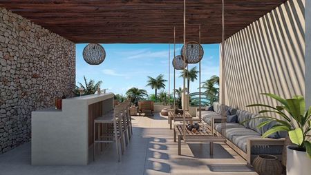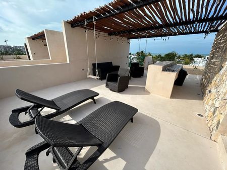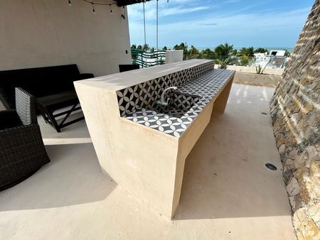 Cuenta con un enorme rooftop que tiene área de hamacas, baños, área de descanso, barra, jardineras y hermosa vista al mar, para poder disfrutar de las puestas del sol y ver los atardeceres. también tiene el área de la alberca con palapa, baños y jardines, para refrescarse en los días de intenso calor.