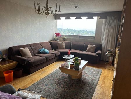 Departamento en venta con cómodos espacios distribuidos sobre 420m cuadrados, consta de 3 recamaras, 3 Banos completos, bano de visitas, sala, comedor, antecomedor, sala TV, despacho, cocina, terraza de 25m cuadrados, 2 cuartos de servicio, 4 estacionamientos, jardines hermosos y salón de fiestas.
