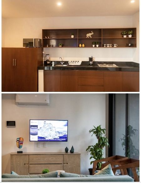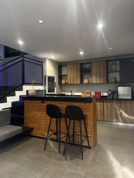 - Cocina con alacena inferior y superior, refrigerador, estufa y horno de microonda, licuadora, horno tostador, horno.