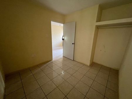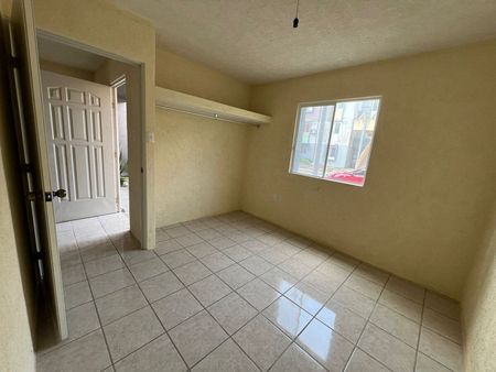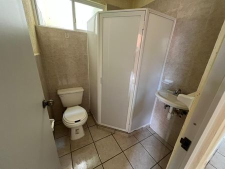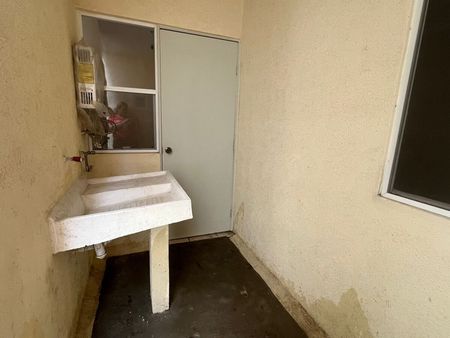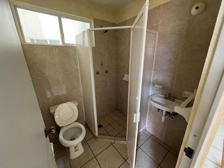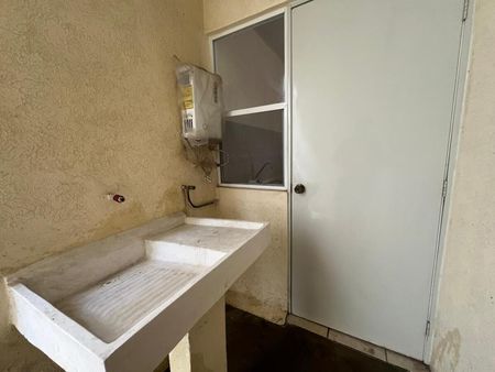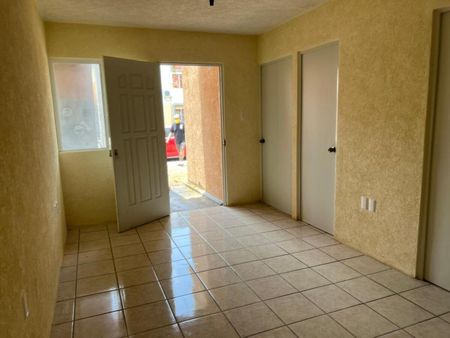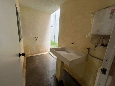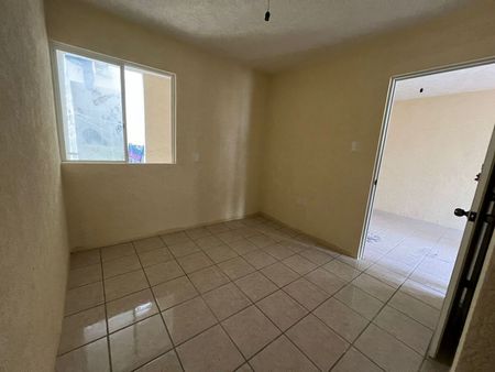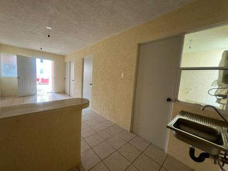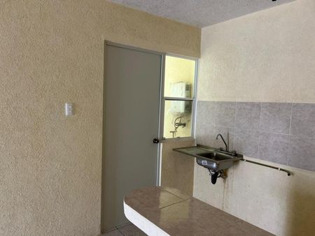Cajón de estacionamiento para 1 vehículo, área de sala-comedor, cocina sencilla con tarja y barra desayunadora, 1 baño completo equipado con cancel y área de lavado con lavabo y calentador.