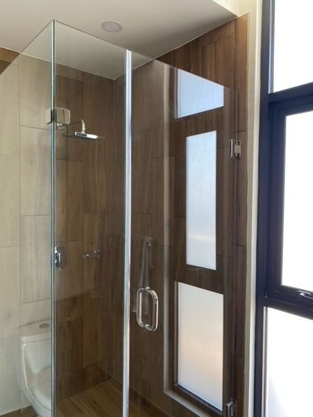 Baños con muebles sanitarios y grifería marca INTERCERAMIC, canceles de cristal templado de 6 mm de espesor con vidrio traslucido.
