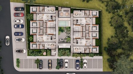 -La planta baja alberga el estacionamiento privado, una caseta de acceso, área social y áreas verdes. Salón de usos multiples, área de asador, jardín, caseta de vigilancia.