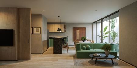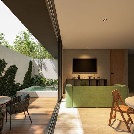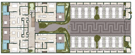 Este nivel cuenta con los primeros 4 departamentos del edificio (001 al 004) que se distribuyen en las siguientes áreas: cocina con barra, sala-comedor, terraza con piscina y jardín, medio baño con closet de blancos, área de lavado, cuarto de estudio, recamara con closet baño completo.