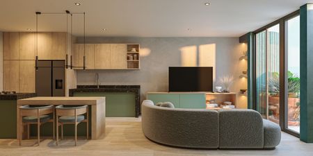 Estos departamentos estarán equipados con lo siguiente: cocina con meseta de granito verde ubatuba con acabado pulido, tarja de submontar de acero inoxidable y monomando, parrilla eléctrica de vitrocerámica empotrable.
