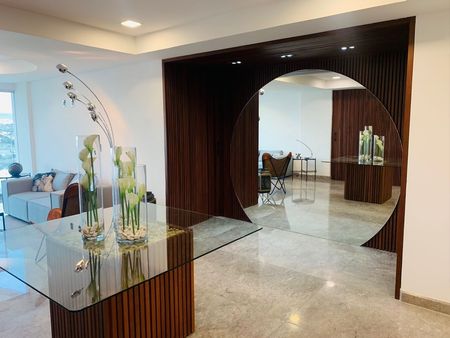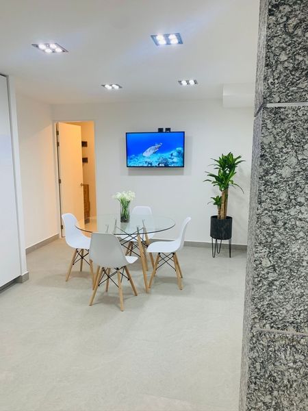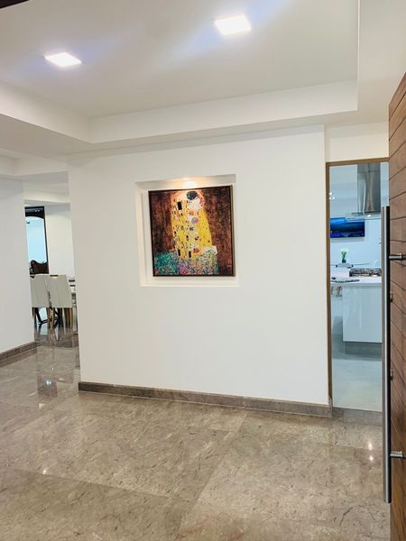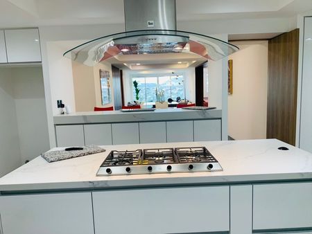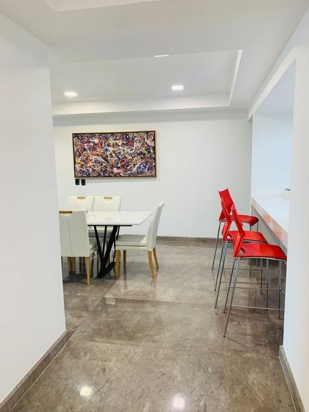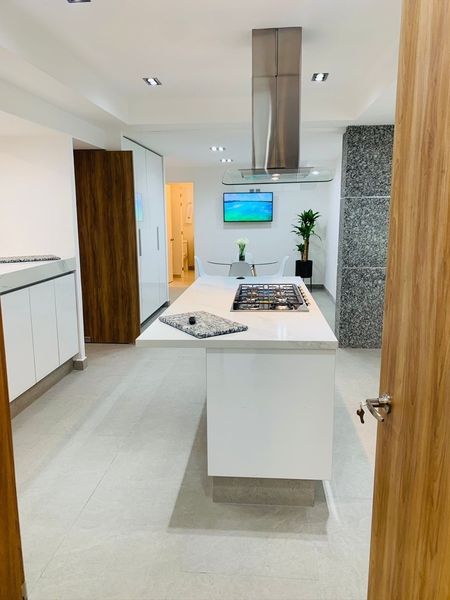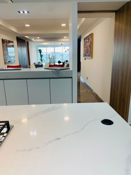 Cocina: con área de trabajo, forrada Granito Calacatta, lavabo forrado de Granito Calacatta. Barra de cocina con área social forrada Granito Calacatta. Campana, estufa, horno de microondas, horno eléctrico y lavabo (TEKA). Piso cocina (Porcelanato Tectonique FD Platino Español 1.20mts x .60mts con zoclos). Puertas y cajones de alacenas, accesorios, cubiertos, ingredientes etc TODO en la cocina referente a puertas son blancas al alto brillo con una distinción en el filo interior metálica entremetida.