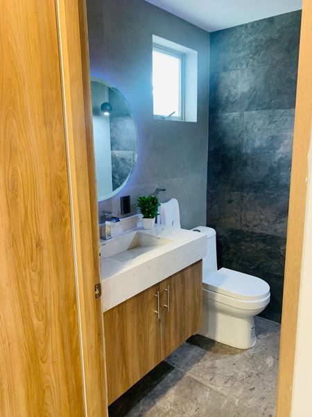 Muro baño visitas (Urban Concrete Grey Español 1.20mts x .60mts y Mirage Dark Español 33.3cms x 100 cms).