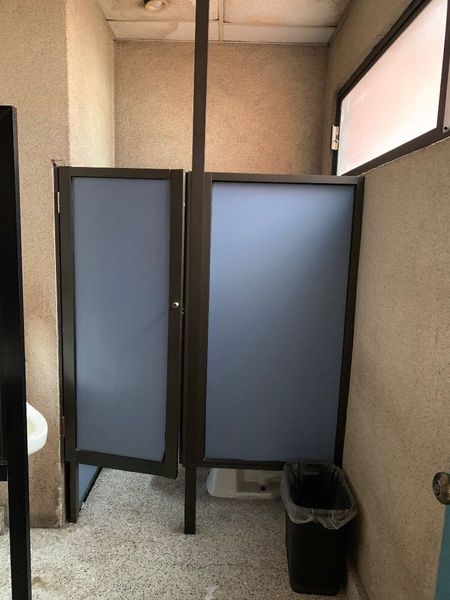 Baños de hombre y de mujeres en la l edificio y reja eléctrica