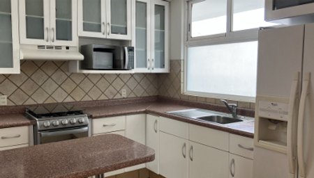 Sala, comedor, cocina integral y despensa, área de lavado y cuarto de servicio, bodega interna, 2 estacionamientos que no se estorban, acceso a roof garden, elevador, vigilancia.