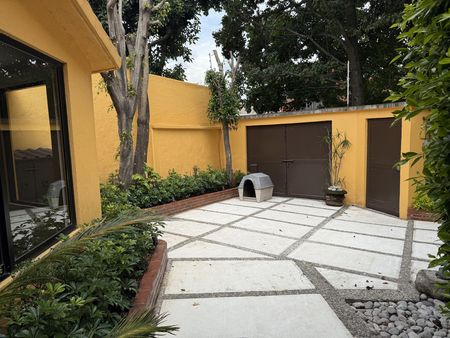 Con un patio a la entrada con frondosos arboles y jardineras .