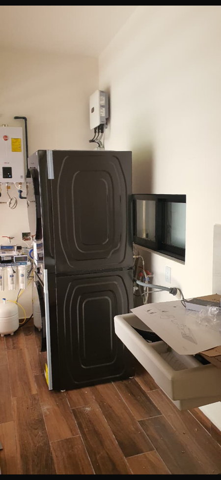 Cocina equipada con lava vajillas ,horno de gas ,horno de microondas ,refrigerador ,campana ,forrada de granito y detalles de madera