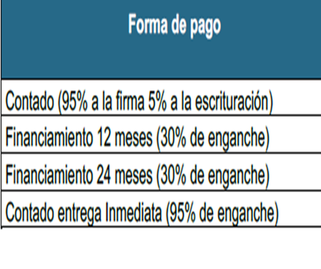 - Contado 95% a la firma de contrato de compra-venta y 5% a la escritura.