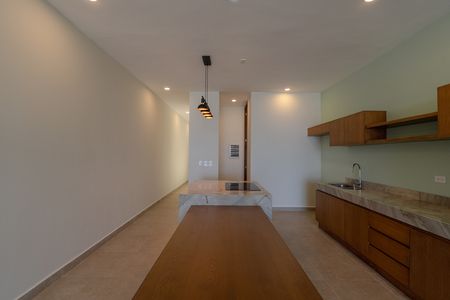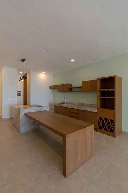 • Carpintería en cocina inferior y superior elaborada con marcos de cedro, cuerpo de listón de encino, acabado nogal claro y corte 45 en puertas para jaladeras integradas. MC6