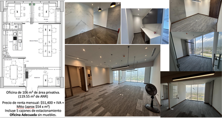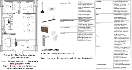 Incluye pisos, alfombra, muro de mármol en recepción, baño, cocineta, canceles en privados, puertas, luces, conexiones, cableados, control de acceso a oficina digital, etc. Únicamente no tendrían muebles.