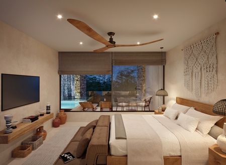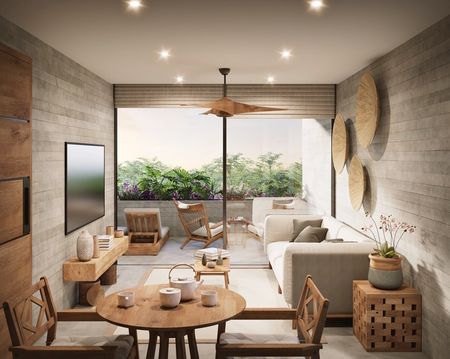 Estos hermosos estudios y departamentos de 1 habitación ofrecen diferentes distribuciones y opciones para adaptarse a sus necesidades, incluyendo opciones de bloqueo para una ocupación adicional y potencial de ingresos. Tienen un amplio diseño de planta abierta con ventanas de piso a techo que dejan entrar mucha luz natural. Todos los departamentos tienen acceso principal, una cocina, clósets en la habitación y un lujoso baño completo. Se abren a una terraza privada con una alberca tipo plunge. Este es un lugar encantador para disfrutar de su café por la mañana o una copa de vino por la noche. Estos departamentos cuentan con materiales y acabados naturales que son duraderos y fáciles de mantener. Se ofrecen a la venta sin amueblar, pero equipados con ventiladores de techo y aire acondicionado.