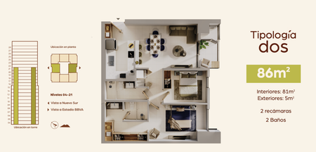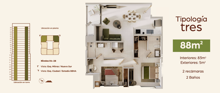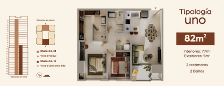 • Departamentos de 2 a 3 recamaras de 82 m2 a 111 m2.