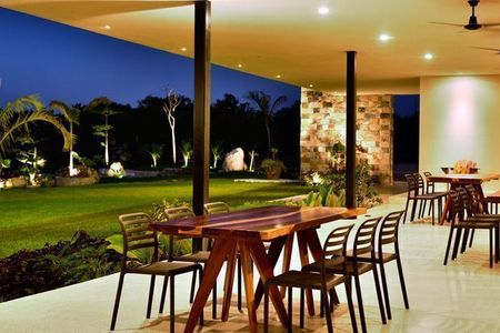 -Terraza techada, de 9.70m x 4.00m, con vistas al jardín principal y área de piscina